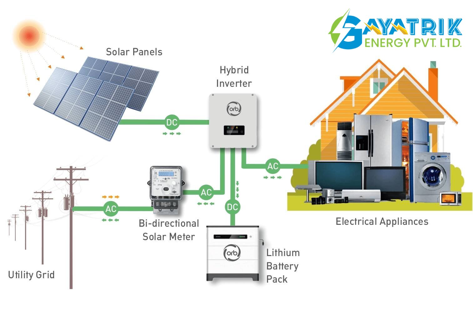 A hybrid rooftop system is basically a mixture of on grid solar power system and on grid solar power system. In this solar photo-voltaic rooftop system, you can store additional power in the solar battery and after your solar battery got fully charged then you can supply electricity to the utility grid.